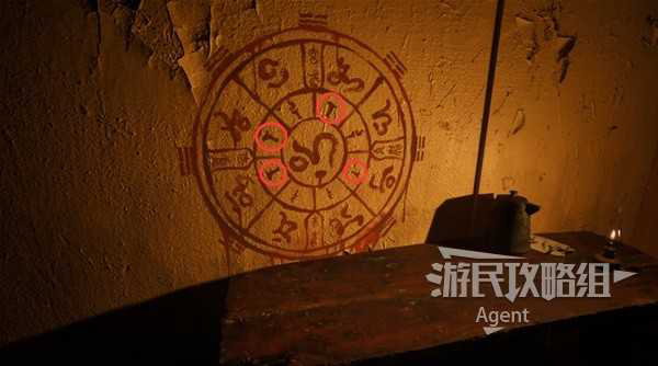 墙上的就是谜题提示,注意内环上的符号,代表熄灭的蜡烛(下图已圈出)或点燃的蜡烛(蜡烛和火苗)。