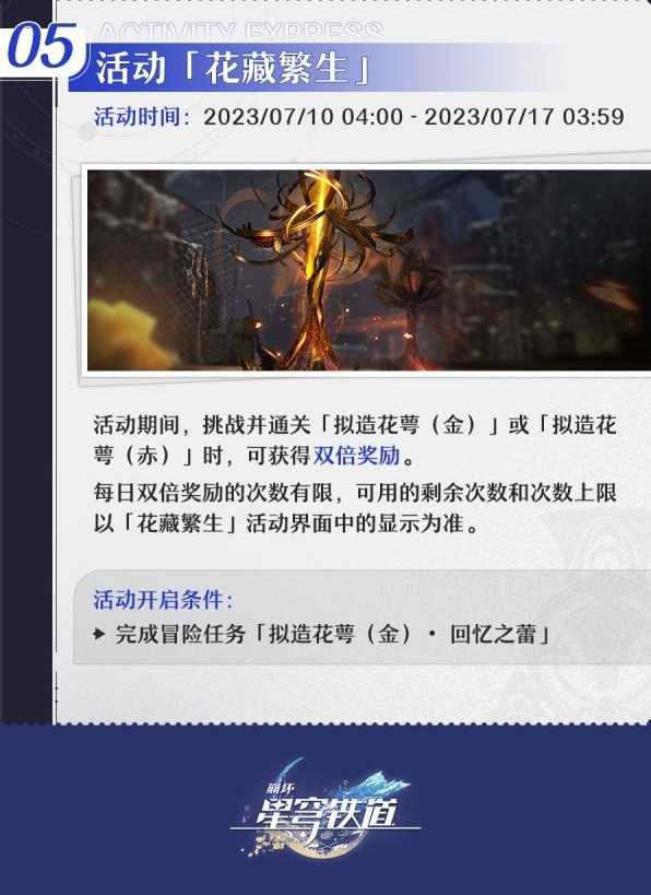 正文 《崩坏星穹铁道》1.1版本下半活动一览「别错过」 闪亮小编 /2025-11-25 14:28:43 /1 浏览量 1125 《崩坏星穹铁道》1.1版本已经过去了一半,很多玩家想要知道后半部分有那些活动,下面请看“崩坏星穹铁道”带来的《崩坏星穹铁道》1.1版本下半活动一览,希望能够帮助大家。 香阁掩,眉敛,月将沉。 -- 展开阅读全文 --
