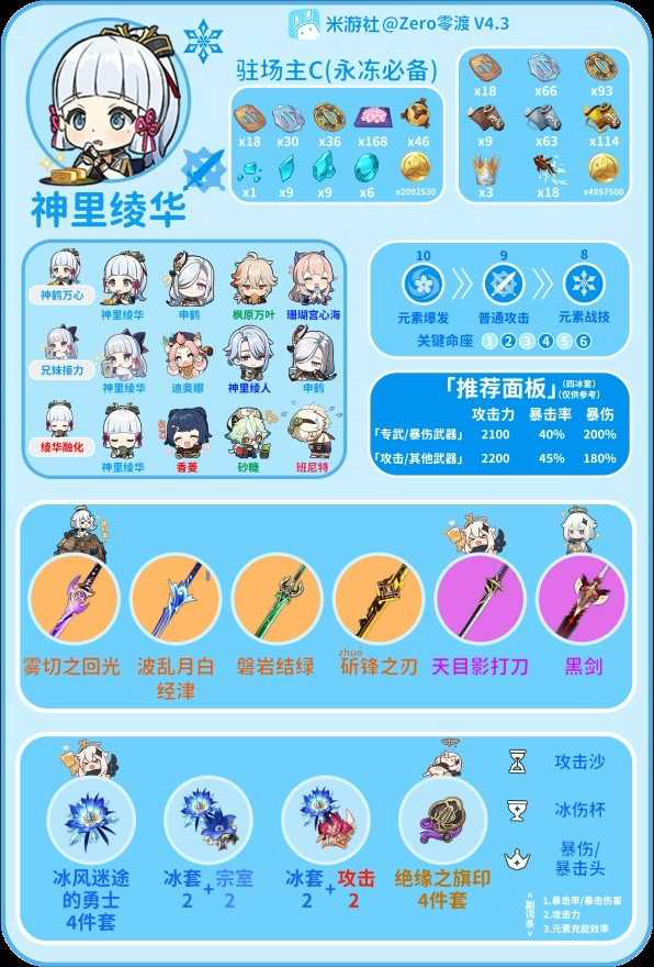 「冰风迷途的勇士」(冰套)四件套。因为现在人手的绫华第一个队伍基本都是永冻队,在永冻队中四件套的效果能吃满,总共提高15%冰元素伤害+(20%+20%)暴击率。所以前面为什么说在四冰套双冰永冻队的绫华只需要一把「波乱」就能达到93.1%的暴击率。