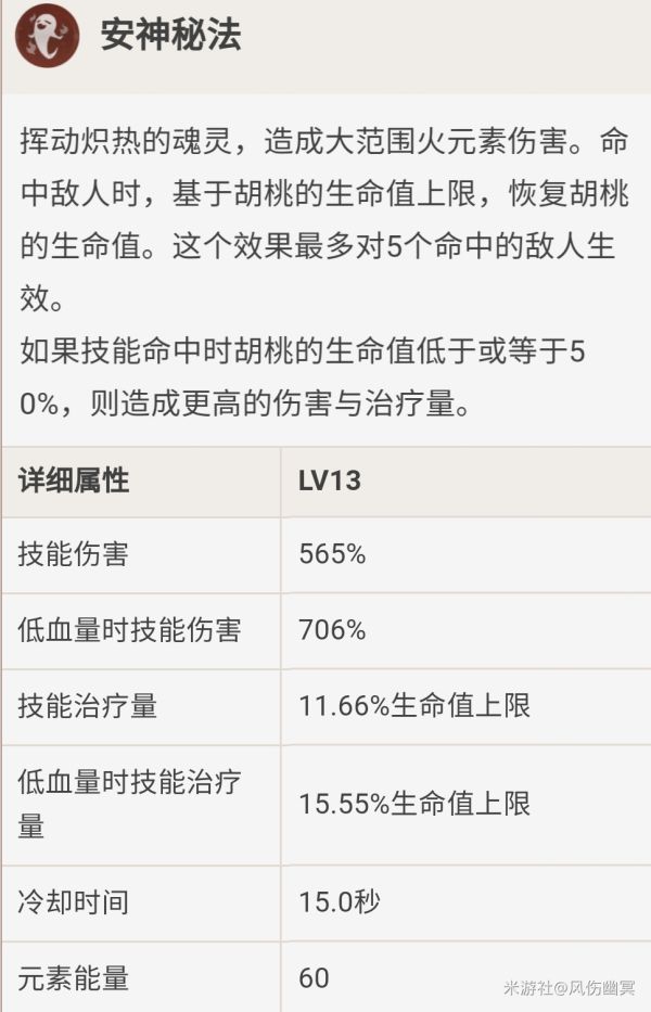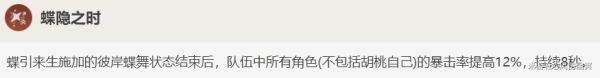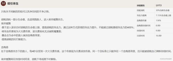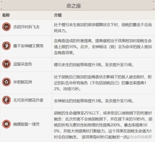 二命:根据胡桃生命高低提升【血梅香】伤害,并且Q技能也会附上【血梅香】了。