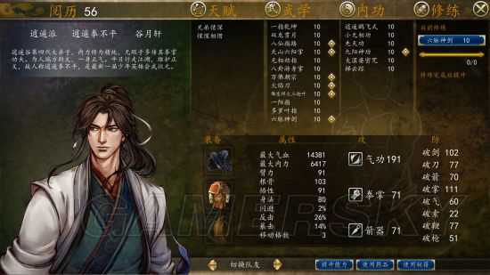 然后是内力,堆内力的方法有两种,一种是上面所说的喝茶,另一种是学内功心法。内功心法的选择需要考虑的因素就比武学要复杂一些了,但是也没有到含混不清的地步。一个心法的作用有两点,其一是增加属性,比如内功、和四维的上限。其二是心法自身所能起的效果,例如逍遥鹏飞式能保护身边的队友,而吸星大法能触发连斩。因此在学习内功心法的时候,首要考虑的是这个角色平时带什么内功心法进入战斗。例如傅剑寒能通过传闻学习到吸星大法,而我在使用他的时候也是选择让他带吸星大法,那么实质上我再给他学其他心法就只用考虑这项心法能增加多少属性了。还是和武学一样,如果考虑喝茶,那么其实就不用学其他内功心法了。如果不想去刷钱喝茶,那么就应该考虑让要培养的角色学满6种心法。