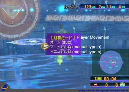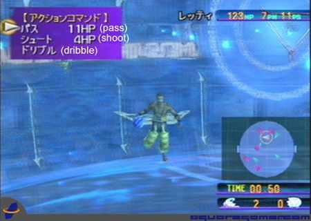 屏幕右下角的雷达显示每名队员的位置,蓝色是Tidus的队伍,控球队员周围有个圈,目标是游近对方球门,尽可能靠近之后射门,途中你会受到对方球员的阻截,迫使你决定己方球员的下一步行动.