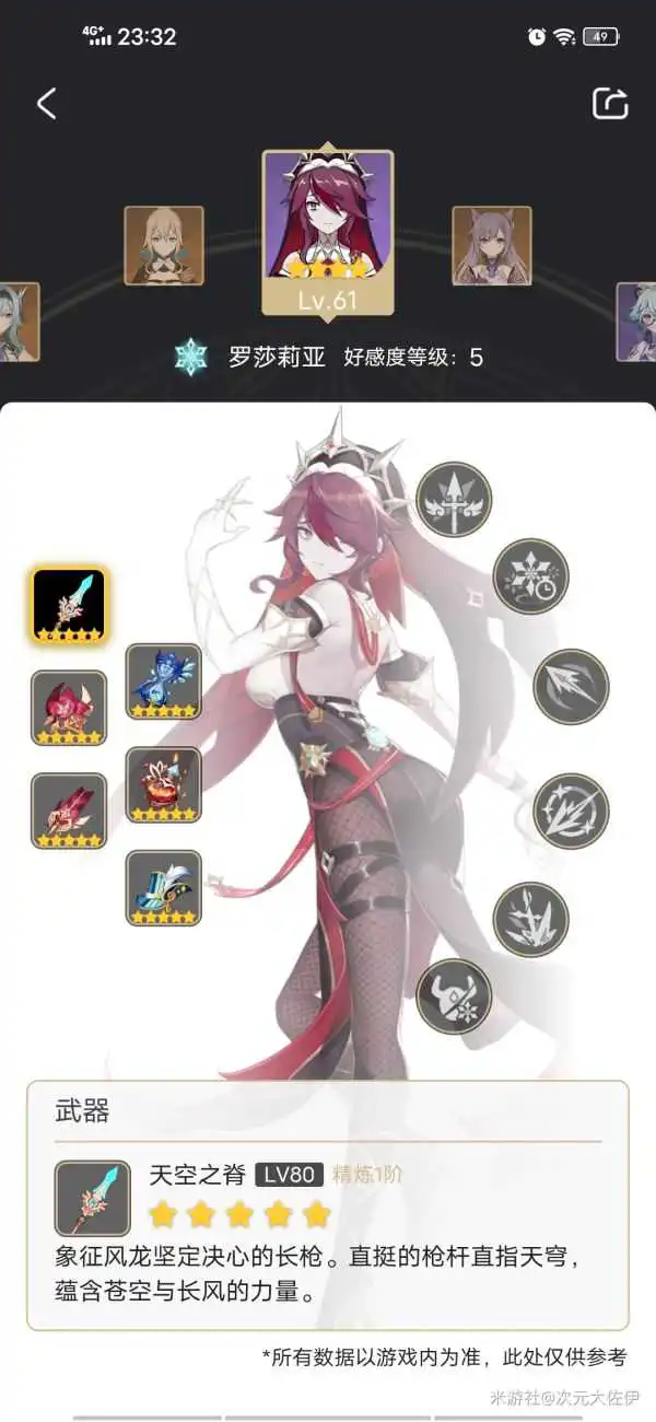 针对物理系选出刚好满命罗莎莉亚(减物抗,大招增加暴击率,所以带的暴击头70多暴击率),建议宗室四件套,本人没刷宗室所以用的其他代替,皇女带千岩四件套,能持续后台增加全队攻击,并且雷系减抗性,同时脱手伤害。