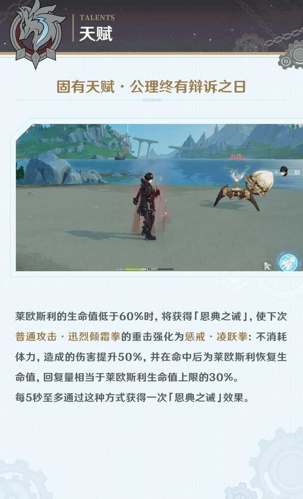 莱欧斯利会自动交互一定范围内的水钱箱与摩拉箱,并且在梅洛彼得堡交互谕示裁定枢机时,小概率获得特许券,该效果不消耗元素能量
