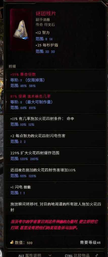 副手:核心、绑定 谜团残片,关键属性,1点智力增加电火花2点基础伤害,范围roll越大越好。合成词缀 爆伤、法术暴击率 ,世界掉落、很容易出孔