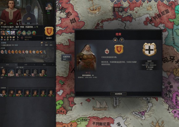 版图如下,我扩张比较佛系,第一个帝国成立的比较急,后面的都是只有拥有王国头衔的人过来我才宣战,否则就看海了。最后也建立了5个帝国。