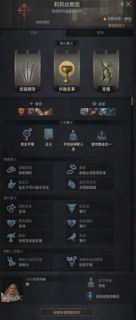 再就是共荣盛事的教义,这个教义教宗可以卖赎罪券,所以信仰领袖选世俗也就是我们来兼任,只要控制2个圣地就可以建立信仰领袖完成政教合一,赎罪券一张最少100块钱,多的会给200,300块,每个月都能卖2,3张。