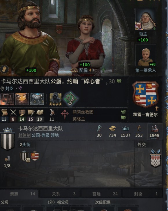 开局前期快点结婚生出继承人是比较重要的,无论CK2CK3都是一样,结婚对象前期尽可能选择强大的盟友。