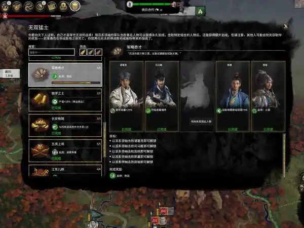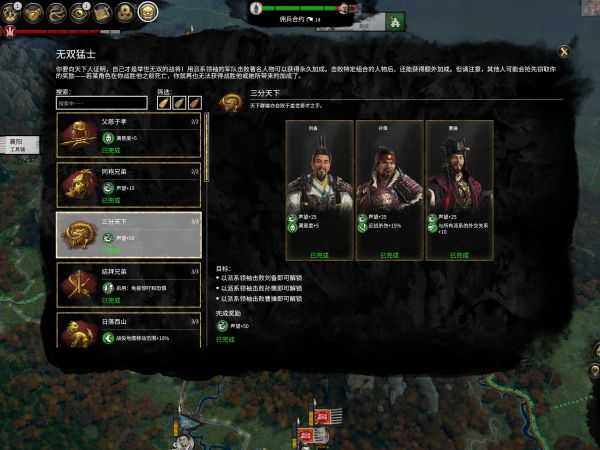 吕布初期除了无双猛士任务由吕布亲自出来打,其他的作战一律让其他武将打,以避免个人胜利过快导致的带来的满意度下降和外交惩罚DEBUFF,以及声望增加过快导致称帝迅速四面楚歌。同时也方便吕布空降完成无双猛士任务,因为你不知道什么时候就在大地图上发现你的目标,吕布就随时待命击杀任务目标。