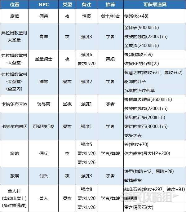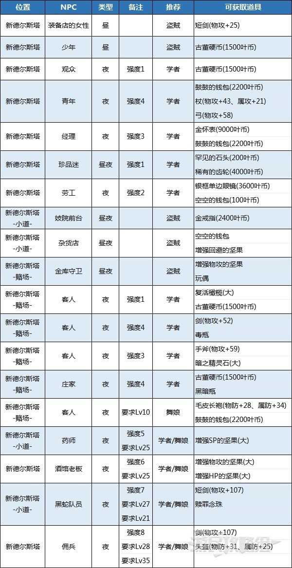 - 新德尔斯塔:从武器店前的村民处获取情报,短剑(物攻+97,属攻+93,20000叶币)、杖(物攻+53,属攻+105,19000叶币)