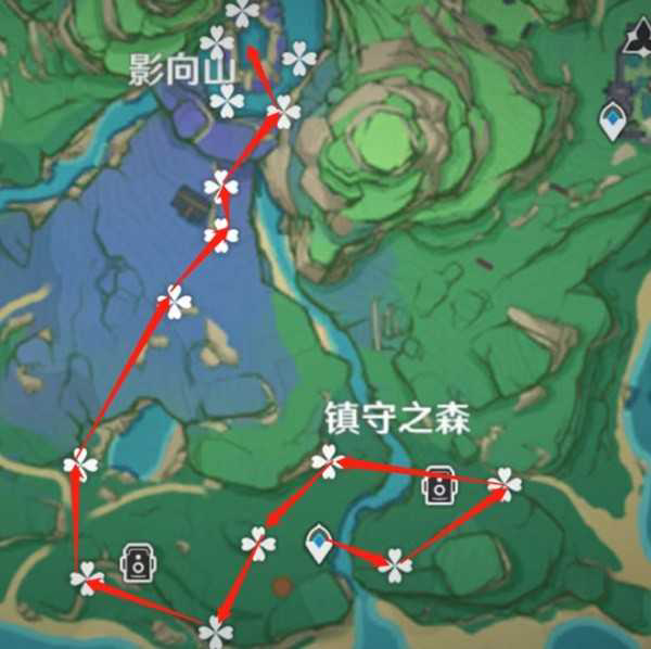 按图示点位走即可,位置较为明显,较高的绯樱绣球可用雷属性弓类角色蓄力攻击,最后的一片点位是在影向山裂口下方,需完成世界任务 [神樱大祓] 后解锁。