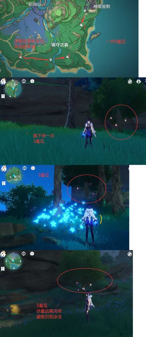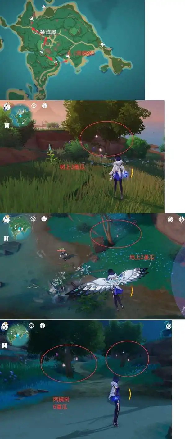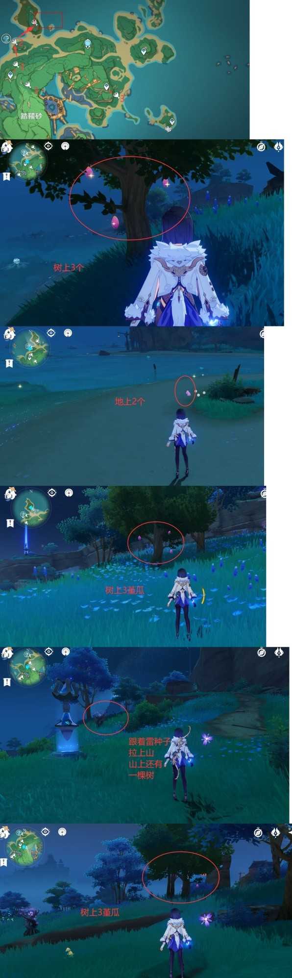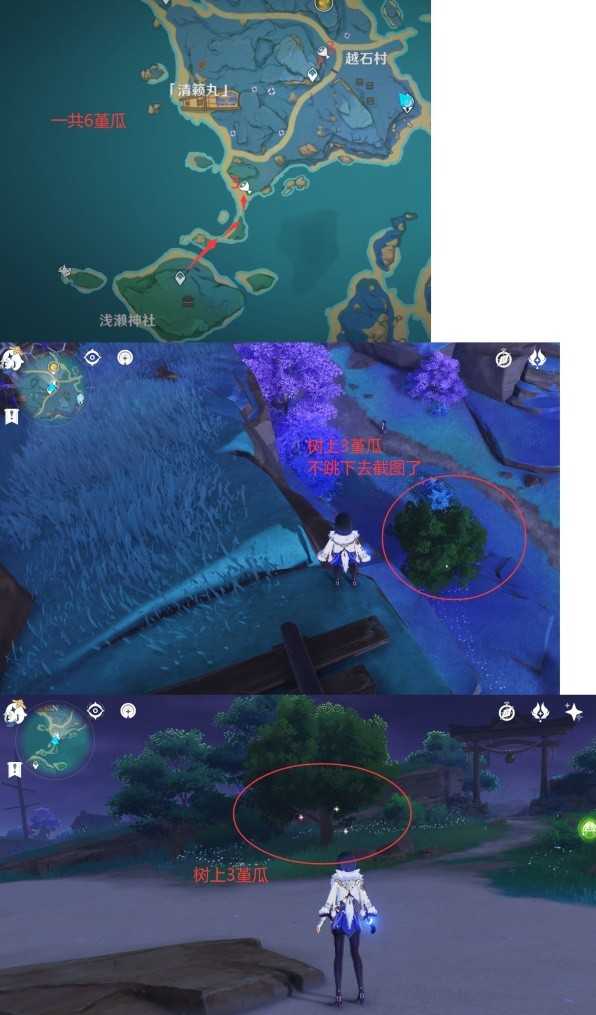 注意,第二张图是给你看堇瓜树分层的,然后最后两棵树是在鸣神大社右边,飞的时候找一找就行