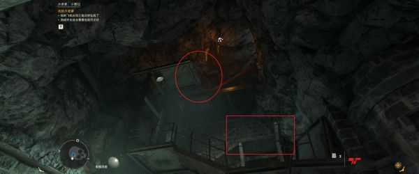 进入洞穴抬头看 走到红框位置挂钩荡到红圈位置