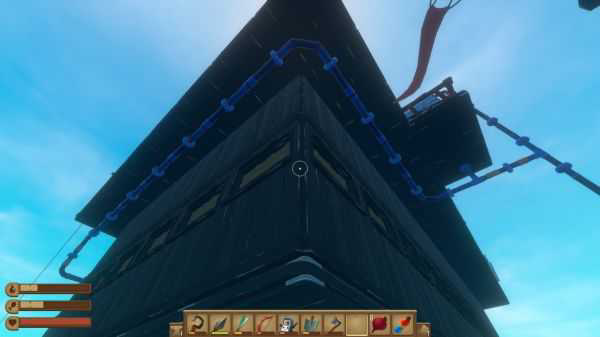 船的后面除了6组染料机之外,还有两个净水器,通过一根管道进入顶层蓄水箱(水塔),接入4太灌溉机,因为我的操场是36块,每个灌溉机可以覆盖9块区域。