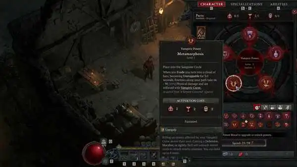变形(2凶暴、2神性、2永恒):闪避时会化身为一群蝙蝠,并进入不可阻挡状态,持续4秒。你会对路径上的敌人造成160%物理伤害,并施加吸血诅咒。