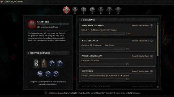赛季旅程分成不同章节,每个章节都有任务需要完成。随着旅程进展,你将获得最符合庇护之地守护者的奖励,像是全新的传奇精华、血肉拼盘坐骑、条带与尖点坐骑护甲,和3个可免费重置技能树和颠峰面板的失忆卷轴。旅程还会提供恩惠,可以通过恩惠来提升战斗通行证等级。在游戏各方面的过程中可以很自然地获得恩惠。