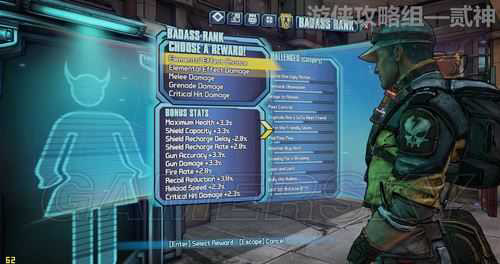 5.BADASS RANK模式 (在菜单的最后一个选项,别忘了):类似于挑战模式,完成相应的挑战会有相应的点数,可以永久增加武器伤害、射速、换弹夹速度、元素伤害。虽然每一点提升很小,但是积少成多,提升的属性还是很可观的。