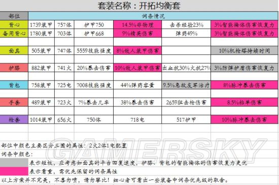 从我个人理解,开拓套设计理念还是利用吃喝提升自我全程覆盖BUFF及给予团队所有成员50%时间段的增益效果。所以这套装备也是以辅助要求为核心诉求(毕竟装备上并无直接增益伤害的特效),利用词条尽可能降低电子投入,反向增加到火力和体力上就是我的做法。而以目前268的属性基值,已经可以轻易完成一般体火使用武器所有天赋激活的2825要求了。