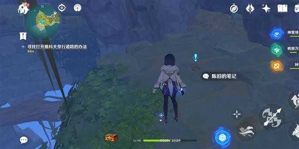 然后我们回到水占镜的位置,回到现在的危危岛,阅读一下笔记,跟着指引来到遗迹,这里有一个洞,跳下去。