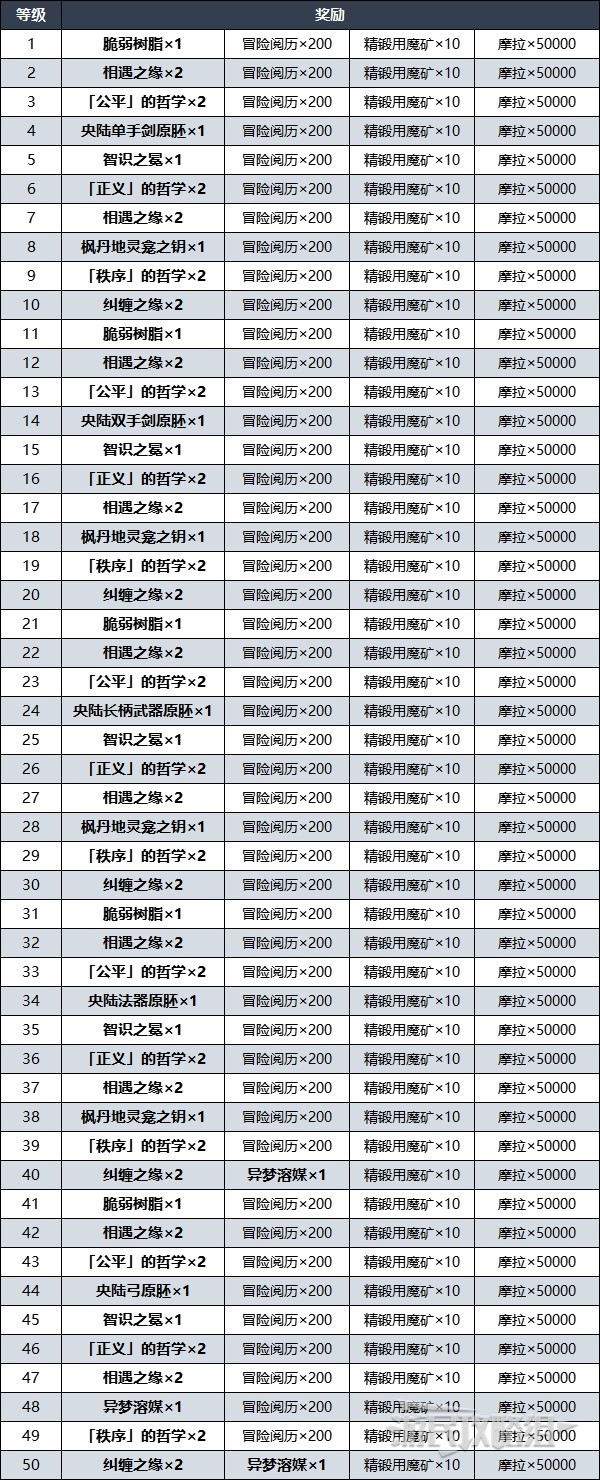※下表中列出的Lv6之后的奖励部分为参考草之印、雷之印后推测得出。每一级可以确定获得的固定奖励有:冒险阅历×200、精锻用魔矿×10、摩拉×50000(除Lv40和50)。