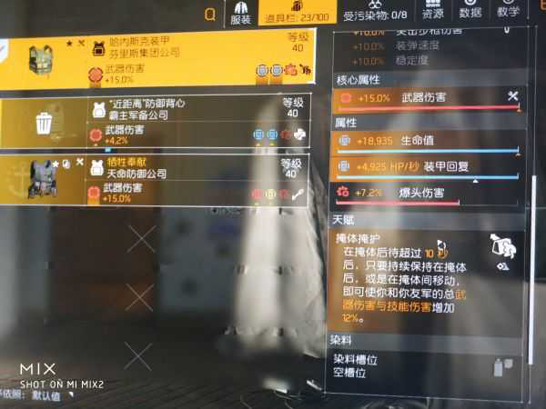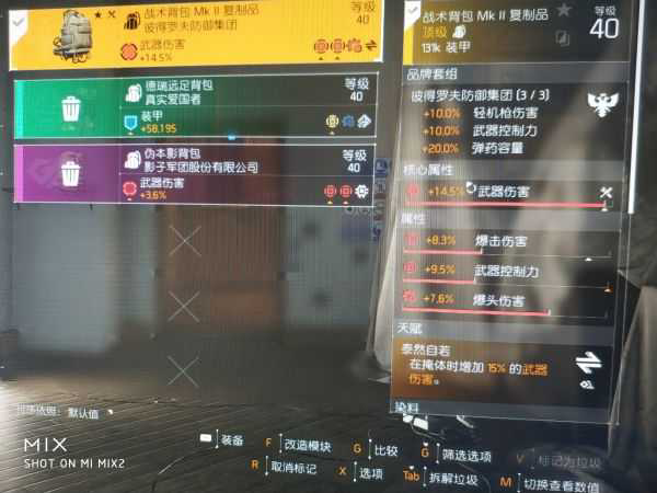装备核心属性的选择没有什么好说的,全部武器伤害就行,次要属性优先暴击几率和暴击伤害,如果觉得自己实在压不住枪可以洗几个武器控制力(不推荐洗,全境封锁2的后座力比起全境封锁1已经小很多了,能自己压住就尽量自己压,实在不行装几个稳定性配件,别浪费属性槽)
