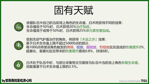 天赋二:受到护盾治疗的角色可以提高草元素相关反应的伤害。