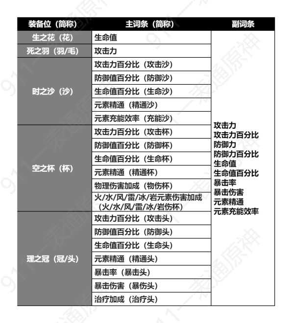 2、圣遗物各装备位可能出现的主词条和副词条类型: