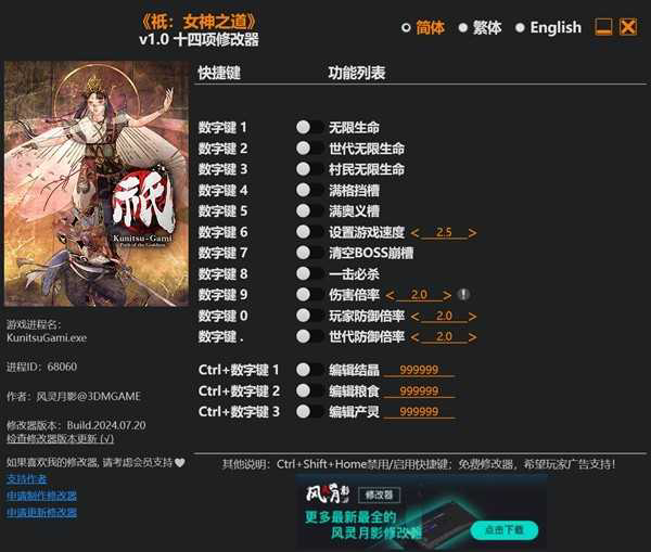 简体、繁体、English,可以切换语言 (切换语言后修改器将把该语言设置为默认语言)