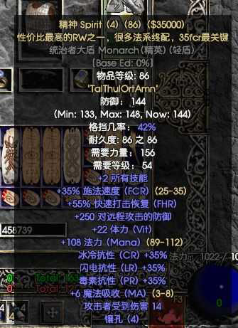 灿烂,这玩意1技能10快速施法,20MF,的二孔盾1般是前期过渡用,或者我截图这种带技能的死灵法师盾,主要5,6技能的死灵法师盾比较有生之年,这个4技能的能凑合过渡用用。