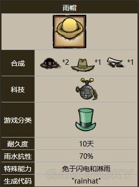 真心感觉做这个还不如做雨伞,真心不知道为什么制作这个还需要2只小地鼠,诶可怜我的小老鼠啊,虽然防雨有百分之70但是人们还是更愿意制作雨伞,毕竟雨伞只要几个蜘蛛网和猪皮比较容易获得。