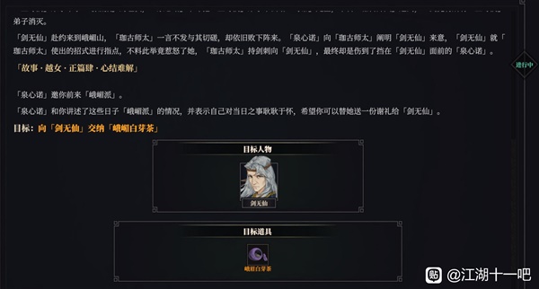 《江湖十一》中的越女任务中需要玩家把峨眉白芽茶带给剑无仙,但是很多人不知道怎么获得峨眉白芽茶。下面请看由“wukong775”带来的《江湖十一》越女任务峨眉白芽茶获取教程,一起来看看吧。
