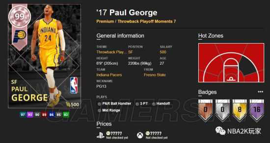 不得不再提一下,SF小前锋的位置上实在是人才济济,强如乔治也只能在目前小前中排在第6位(西蒙斯两张重复粉钻)。不过等小编说完以下的内容,相信喜欢乔治的朋友们就不会介怀于这个数据值的排名了,先说说排在乔治前面的字母哥和西蒙斯,这两人都有着相同的短板,那就是外线投射能力,虽然2K拔高了他们的三分能力值,让他们的外线处于可用范围,但没有名人堂徽章的加成,命中率肯定还是不如乔治的,更何况乔治还拥有着舒服的投篮手感。至于另一位粉钻伯德,目前市场上应该已经很难见到了。这样看来,除了詹姆斯就是乔治,当然了,还有紧随其后的杜兰特。不过对于打法偏向冲扣及突分的非泡椒球迷而言,这张粉钻乔治就没有明显优势了。