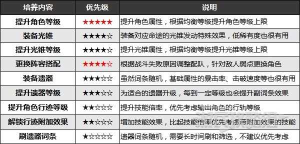在剧情和副本中遇到打不过的敌人时,如果配队合理,技能使用等方面没有失误的话,基本就需要通过各方面培养角色来提升战斗能力。各方面培养优先级如下: