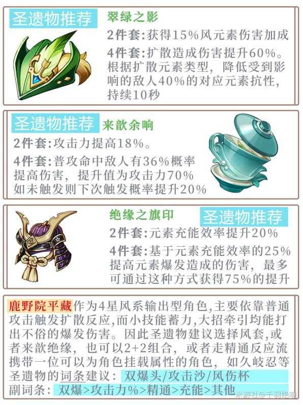 圣遗物选择建议风套,或者来歆、2+2组合。而风套无疑是最契合的。