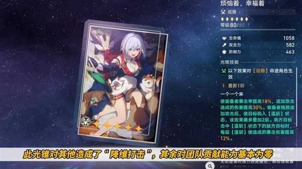 这或许是有史以来全队提升最大的输出角色光锥,【烦恼着,幸福着】可以标记敌人,后续全队对其攻击时都会提升暴击伤害,叠1都可提升24%,太强了。