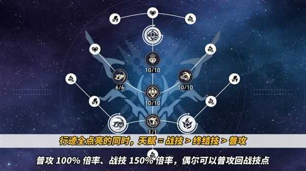行迹全点亮的同时,天赋=战技>终结技>普攻。条件允许的情况下建议把普攻也点满,满级情况下普攻100%倍率、战技150%倍率,点亮【透支】后普攻也是视作追加攻击,不改变目标的情况下适当普攻产点提高全队循环是非常有必要的。