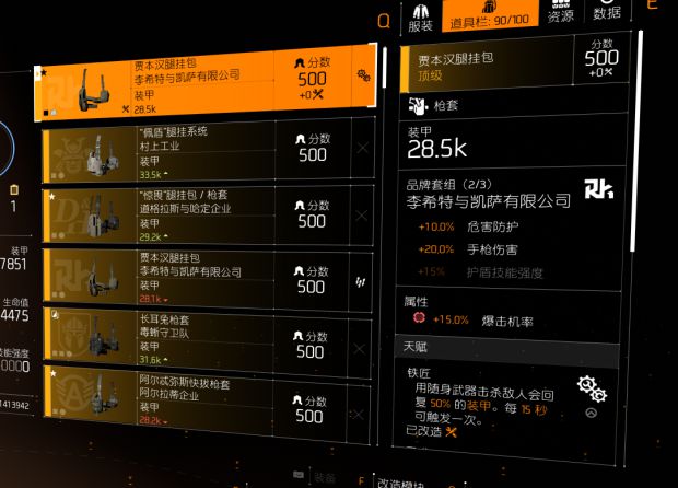 面罩和枪套选择李希特与凯萨公司,如果你选的是犀牛的背心天赋,那么你可以选择精伤+爆率的面罩词条,天赋重击。