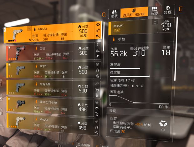 武器方面选择M45A1手枪,手枪是我们的主武器,这把手枪威力大,射速快,配件能装的也是最多的,后坐力也很小,准确度不错,很完美,天赋选择拾荒,配件选择微型反射瞄具+5暴击率,枪口选择増音制动器+10射程,弹夹选择+11子弹的加长弹夹,下挂选择+10暴击率的镭射,武器不要选择自由或d50,即是他们的面板达到了110k-120k,因为他们的后坐力太大了,射速还慢,弹夹还少,谁用谁知道,副武器选择话匣子,增加射速,另一把随意。