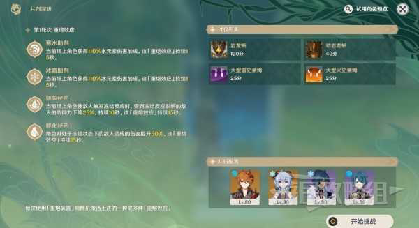 - 讨伐目标:【第一轮次】愚人众先遣队·风拳先锋军/岩使游击兵、镀金旅团·炽阳凝冰/白日鸣雷/阵前斧手/机弩兵/鸦喙戟手/刀舞者、盗宝团·拳术家/掘墓者/火之药剂师;【第二轮次】丘丘霜铠王、冰深渊法师、冰盾丘丘暴徒、大型冰史莱姆、冰弹丘丘人;【第三轮次】嗜雷·兽境猎犬/兽境幼兽