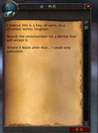威·娜莉对噬渊行者的战利品一番端详之后,也只能得出这是一把钥匙的结论,她建议我们重返托加斯特,看一看这把钥匙到底是哪座密室的开关。