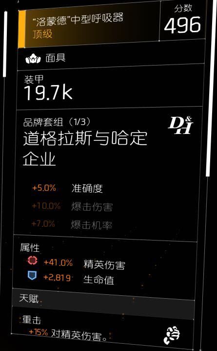 面具最好是选择红蓝词条或者红黄词条的中国光面具,主要是因为两件套的霰弹枪加成。我没刷到好的我就将就用这个精英伤高一点的。注意:探子和预料之中冲突,所以不要用探子,天赋带重击。
