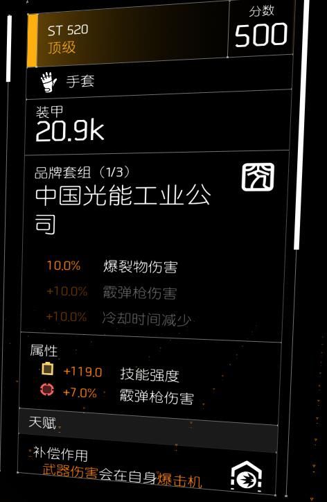 中国光手套,和面具搭配就能再多10%喷子伤害。红+任意+补偿作用,这样红条可以洗到11的喷子伤加成,我这个手套因为天赋不对,洗了补偿作用将就用吧。