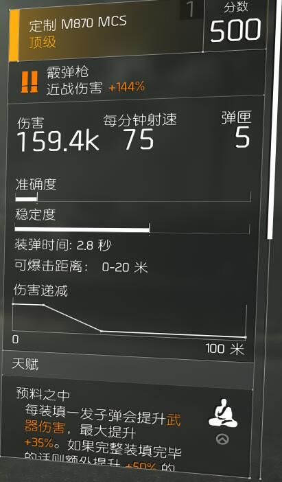 喷子选择m870,关键比spas12多上一个枪托可以加快装填速度,5发弹夹配合预料之中更快拿到满加成buff,上个镜子也能多打一点输出。我面板武器加成不是很高,所以白字不好看,下版本我洗一个12武器伤之后要好看一点。