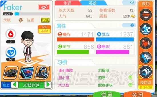 然后整个流程就是先升活动和赞助,用b训练满打到a再换,然后换s+faker加闪避套路可以虐ss,后期没难度,训练满就行了。