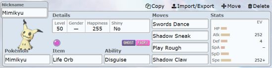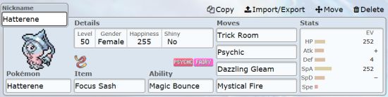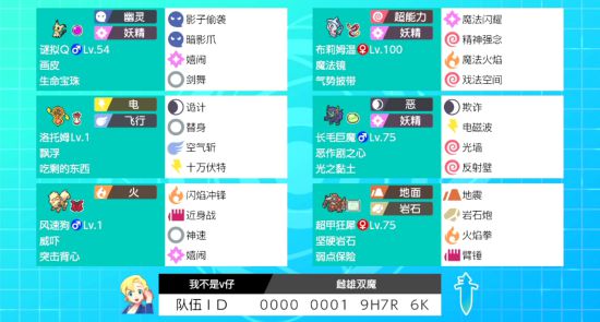 原队伍选用的是物耐mmq来开空间,但我在ps上试过之后发现mmq虽然依靠画皮拥有很棒的生存能力,但在开完空间之后极容易卡场(即使携带诅咒),尤其是当对手刻意为之的时候更是如此,很多时候都没有足够的空间回合留给打手进行输出,所以我这边换成了本身具有一定输出的布莉姆温来开空间(同时布莉姆温也是我剑盾孵出来的第一只能用的闪)。在写爆队的时候才发现ps上的性格弄错了,应该选用冷静的性格,为保证输出能力将特攻拉到极限,其余努力加满略显贫弱的hp,道具方面为了保证稳定开空间不被秒杀而选择了气势披带,魔法镜特性加上气势披带首发基本是稳开空间,排除被各种技能畏缩的情况(第一轮就被狒狒冰柱畏缩吃瘪了)。技能方面选择了双本+空间,最后一个补盲技能在魔法火焰和终极吸取之间犹豫了一下,最后还是选择了针对草钢的魔法火焰而放弃了对沼王的压制能力,也使得这个队伍几乎完全没有办法打沼王。基本用法就是首发开空间,然后视自身血量情况和对手队伍情况选择打一下炮灰/直接换上打手/极巨化开干。