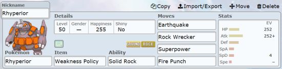 空间打手沿用了原队伍的弱策重暴,努力为了省事拉了252,实际上考虑到综合耐久可以多拉一些特防的,但嫌麻烦就没弄,毕竟有沙暴和极巨地还可以强化特防。技能方面就是朴实无华的四攻,实机上使用的是臂锤而不是蛮力主要是不想浪费tr。如原队作者所说,目前很多环境的热门pm都无法阻挡空间下重暴的暴力输出,月赛上也是一路carry,各种1穿3获胜。常规用法就是和布莉姆温一起选出,然后空间下登场极巨化开始杀人。部分强力物盾比如珊瑚、河马兽等,在无法触发弱策的情况下是无法突破的,这时候可以考虑留住极巨化,在空间下先用普通攻击削弱对手,把极巨化留给后排的mmq伺机翻盘。