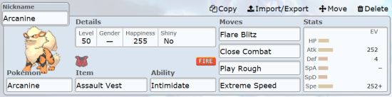 最后是这个背心疯狗,当前环境下疯狗的单挑能力还是非常强,本身种族值雄厚,威吓+背心保证了物特双端的生存能力,又有大威力的本系技能、比较优秀的补盲技能以及神速这个先制技能用来收残,努力方面就选择了无脑252分配,极速可以在面对极巨化的达摩狒狒时保留和对面拼速的可能,满攻保证输出能力。技能方面携带了火本,先制技能神速,以及嬉闹打龙,近战打班,但实操下来由于基本没有遇上班因此近战非常少点,可以考虑换成狂野伏特来打暴鲤龙,本身疯狗也有对暴鲤龙的速度优势。