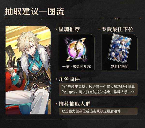 因此综合来说,高压环境缺乏强力生存的推荐抽取,末日中仅有加拉赫辅助削韧的,以及追击队缺乏砂金的都推荐抽取砂金。