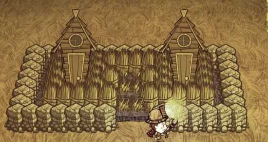 6.紧贴着猪人房摆放草墙,要注意的是,没有出口的长些的那一面墙要贴墙摆一行草墙,中间连接方式看图(如果被卡住按Ctrl强制攻击草墙就行)