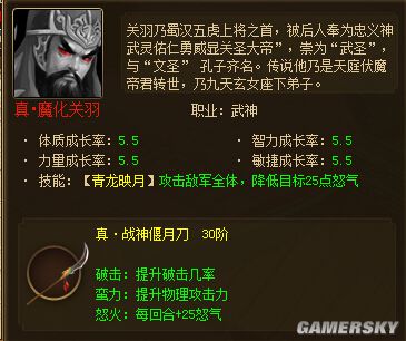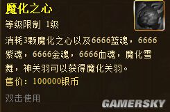 消耗3颗魔化之心以及6666蓝魂,6666紫魂,6666金魂,6666血魂,神关羽可以获得魔化关羽。